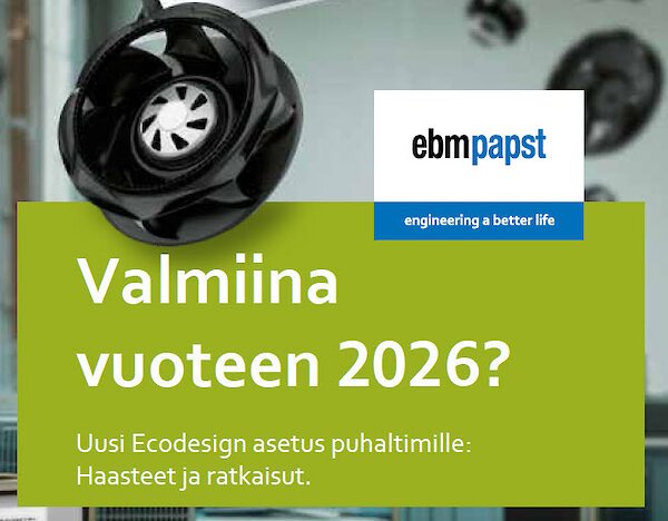 Kun ebm-papst toimittaa täydellisen puhaltimen, vastaamme siitä, että tuote täyttää EcoDesign-asetuksen energiatehokkuusvaatimukset, mukaan lukien CE-hyväksynnän. Mutta mitä tapahtuu, kun toimitamme vain osia puhaltimesta? Tällöin vastuu EcoDesign-vaatimusten täyttämisestä voi siirtyä kokonaan tai osittain asiakkaalle. Lisätietoa aiheesta saat lataamalla alta ErP2026/Ekosuunnittelu esitteemme (PDF).