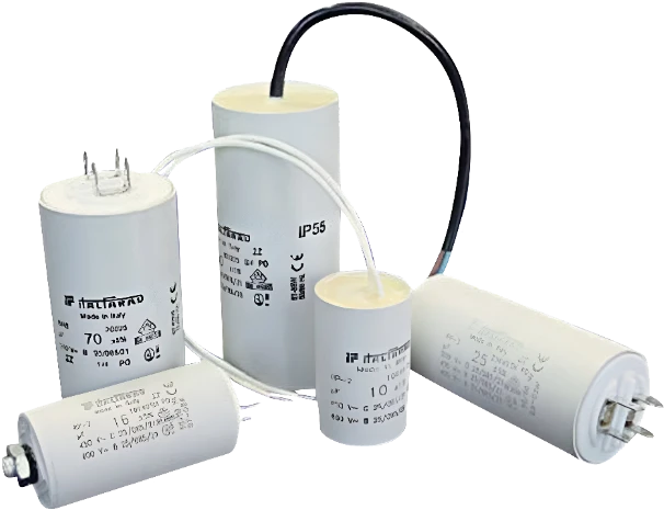Muovikuoriset kondensaattorit yksivaihemoottoreiden käynnistykseen ja käyttöön. Johdon pituus n. 250mm. Metallinen kiinnitysruuvi M8. Nimellisjännite 450 VAC.
